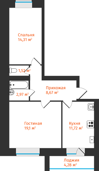 2-комнатная, 60.43м²