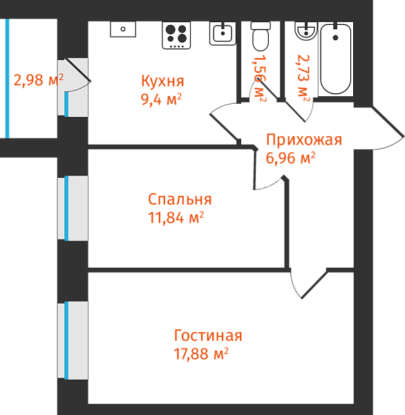 Новая 2-комнатная квартира в ЖК Норские резиденции на 2 этаже площадью 51.86 м² в 1 подъезде номер 6