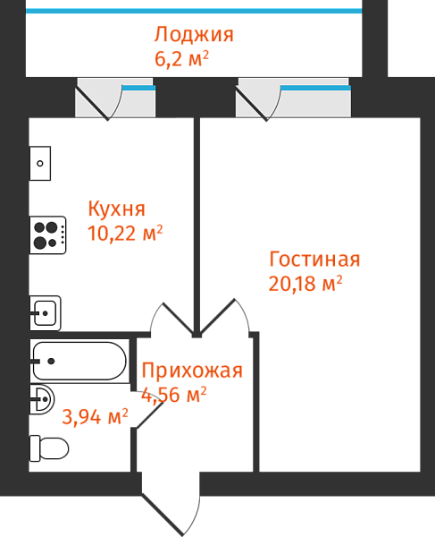 Новая 1-комнатная квартира в ЖК Норские резиденции на 4 этаже площадью 42.00 м² в 2 подъезде номер 35