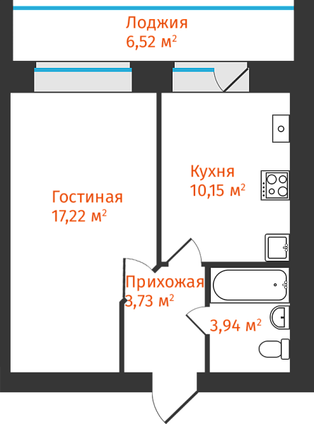 1-комнатная, 38.3м²