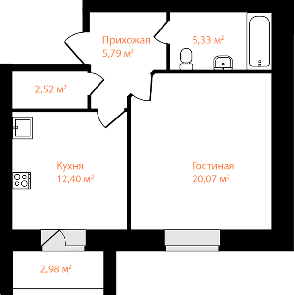 1-комнатная, 47.6м²