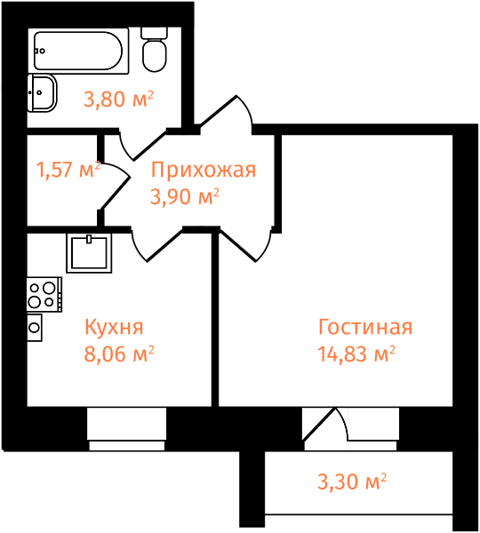 1-комнатная, 33.81м²