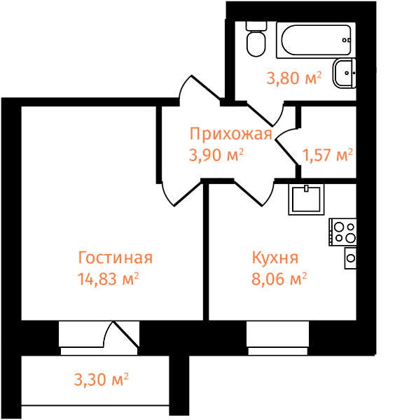 Новая 1-комнатная квартира в ЖК Норские резиденции на 4 этаже площадью 33.81 м² в 3 подъезде номер 42