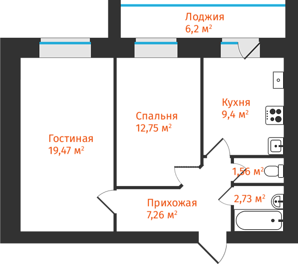 Новая 2-комнатная квартира в ЖК Норские резиденции на 3 этаже площадью 56.27 м² в 2 подъезде номер 30