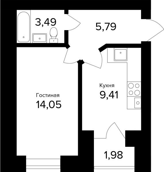 1-комнатная, 35.43м²