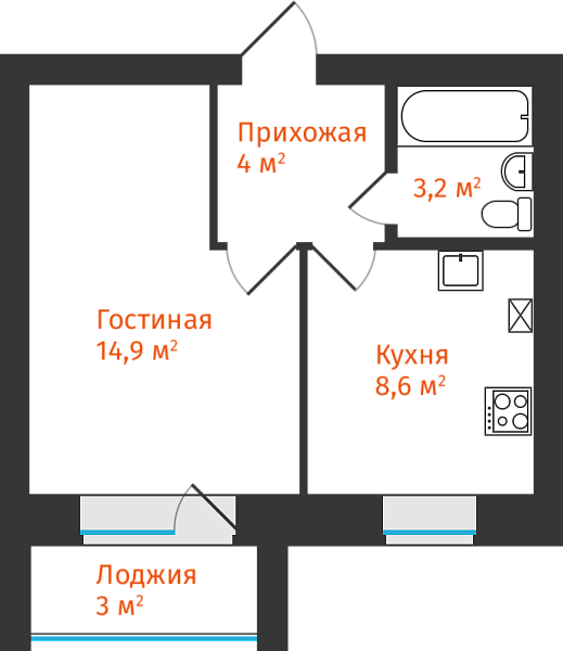 Новая 1-комнатная квартира в ЖК Норские резиденции на 4 этаже площадью 32.33 м² в 1 подъезде номер 16