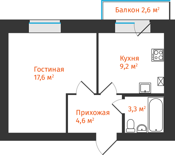 Новая 1-комнатная квартира в ЖК Норские резиденции на 2 этаже площадью 35.63 м² в 1 подъезде номер 9