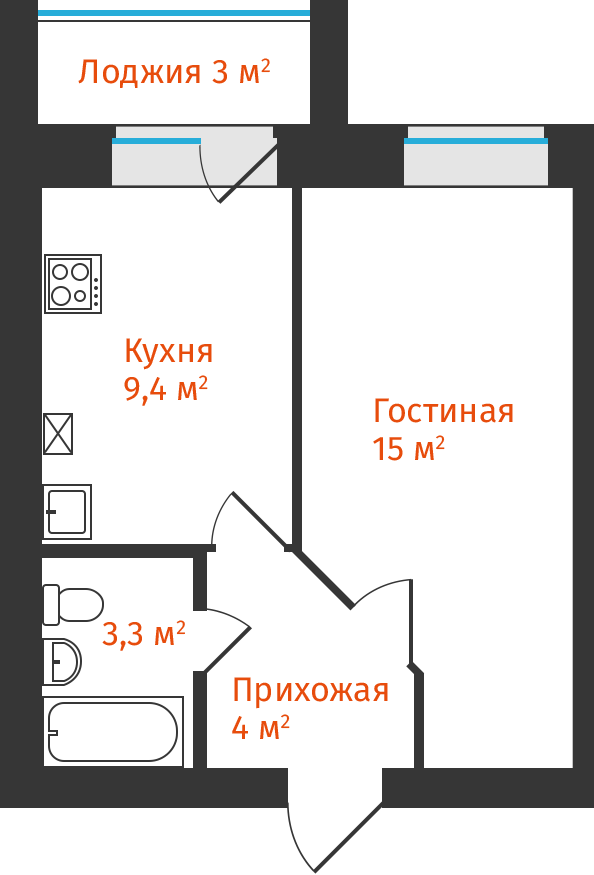 1-комнатная, 33.38м²