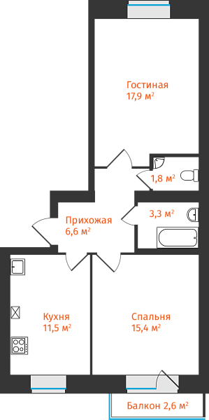 Новая 2-комнатная квартира в ЖК Норские резиденции на 4 этаже площадью 57.38 м² в 1 подъезде номер 16
