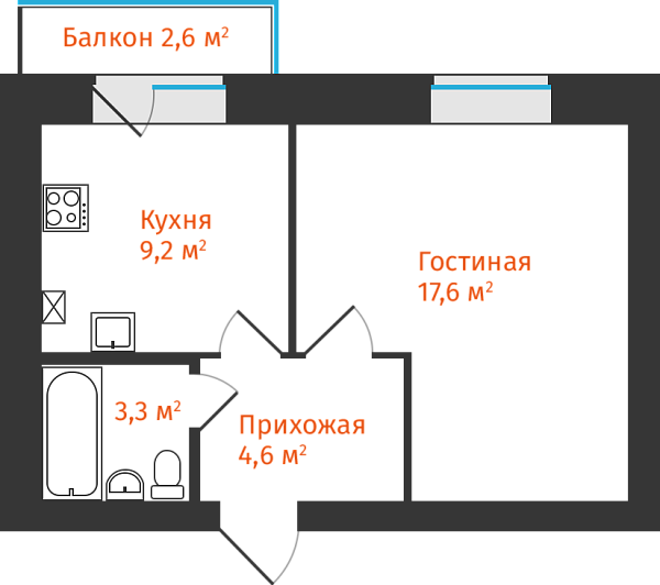 1-комнатная, 35.63м²