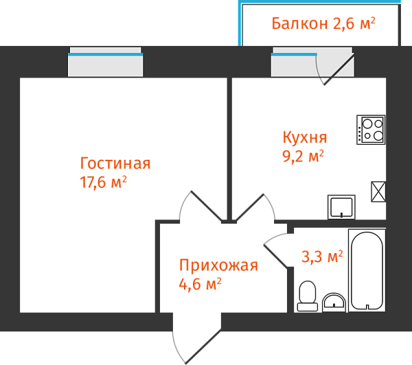 1-комнатная, 35.63м²