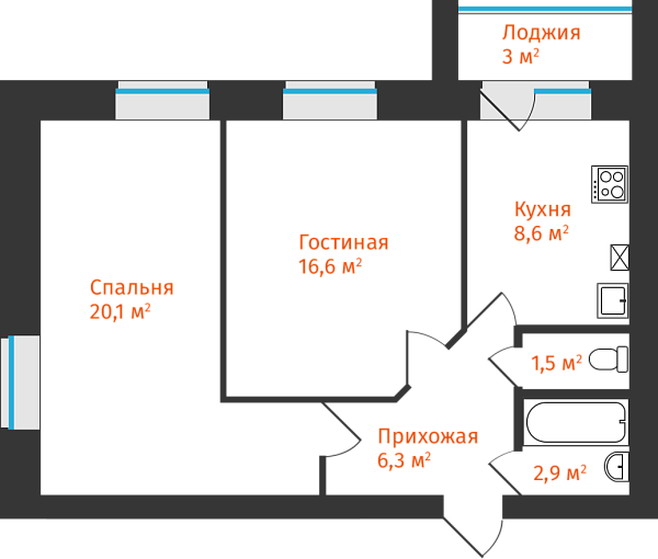 2-комнатная, 57.56м²