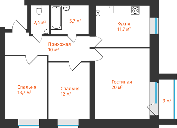 Новая 3-комнатная квартира в ЖК Норские резиденции на 2 этаже площадью 77.61 м² в 1 подъезде номер 5