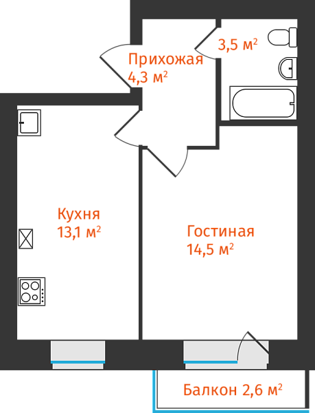 Новая 1-комнатная квартира в ЖК Норские резиденции на 2 этаже площадью 36.19 м² в 2 подъезде номер 22
