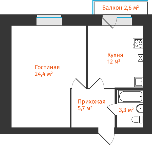 Новая 1-комнатная квартира в ЖК Норские резиденции на 2 этаже площадью 46.25 м² в 2 подъезде номер 22