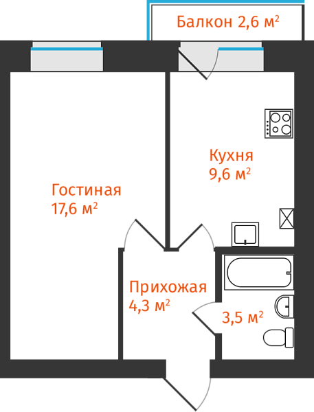 Новая 1-комнатная квартира в ЖК Норские резиденции на 2 этаже площадью 35.82 м² в 1 подъезде номер 6