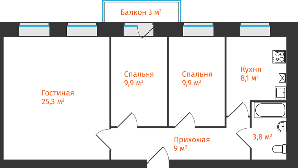 3-комнатная, 66.96м²