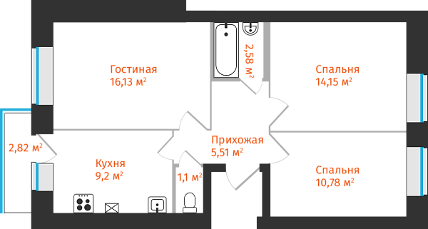 Новая 3-комнатная квартира в ЖК Норские резиденции на 2 этаже площадью 60.30 м² в 1 подъезде номер 6
