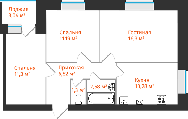 3-комнатная, 61.29м²