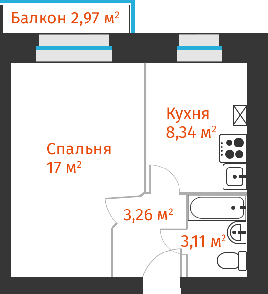 Новая 1-комнатная квартира в ЖК Норские резиденции на 2 этаже площадью 32.40 м² в 2 подъезде номер 27