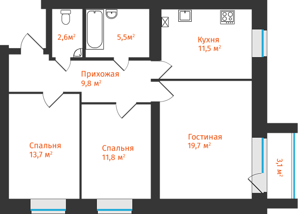 Новая 3-комнатная квартира в ЖК Норские резиденции на 1 этаже площадью 76.25 м² в 1 подъезде номер 1