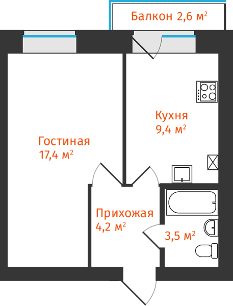 1-комнатная, 35.13м²