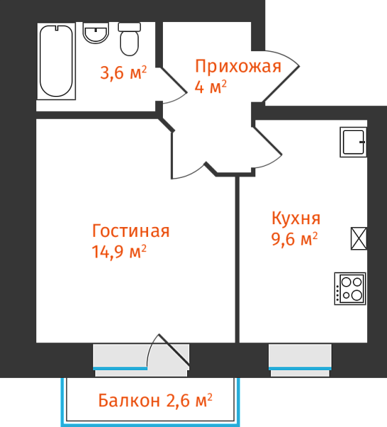 Новая 1-комнатная квартира в ЖК Норские резиденции на 4 этаже площадью 33.98 м² в 1 подъезде номер 13