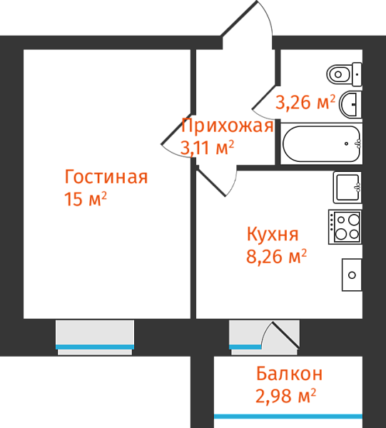 Новая 1-комнатная квартира в ЖК Норские резиденции на 2 этаже площадью 31.12 м² в 1 подъезде номер 6