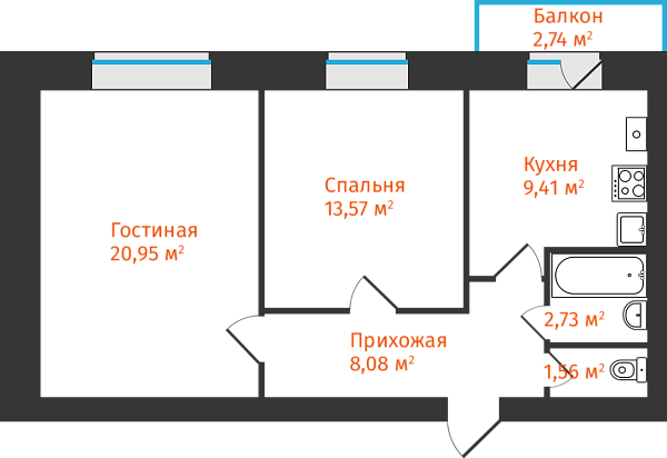 Новая 2-комнатная квартира в ЖК Норские резиденции на 4 этаже площадью 57.12 м² в 1 подъезде номер 18