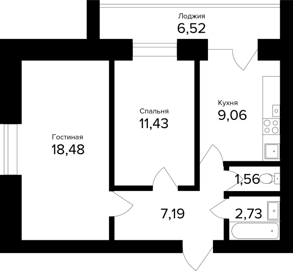 2-комнатная, 53.71м²