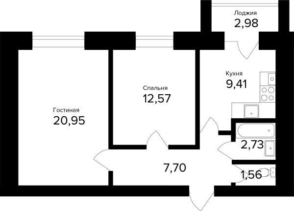 2-комнатная, 56.41м²