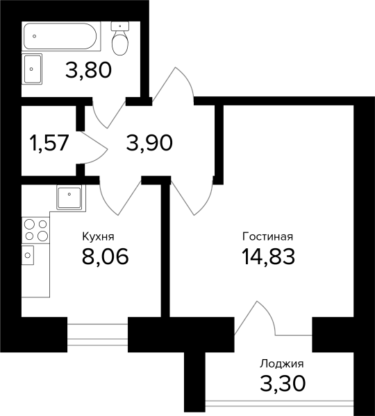 1-комнатная, 33.81м²