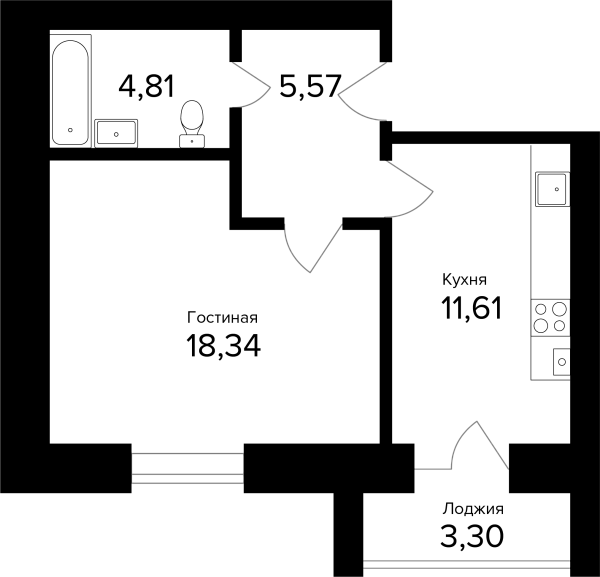 Новая 1-комнатная квартира в ЖК Норские резиденции на 5 этаже площадью 41.98 м² в 1 подъезде номер 13